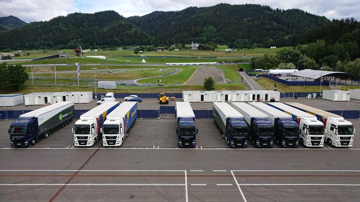 While qualifying for the French GP is taking place at Le Castellet, preparations are in full swing for next weekend’s Austrian GP in Spielberg. After a trip of about 1,480 kilometers, the first trucks that left team headquarters on Wednesday with the pit lane and garage infrastructure on board have now arrived at the Red Bull Ring.